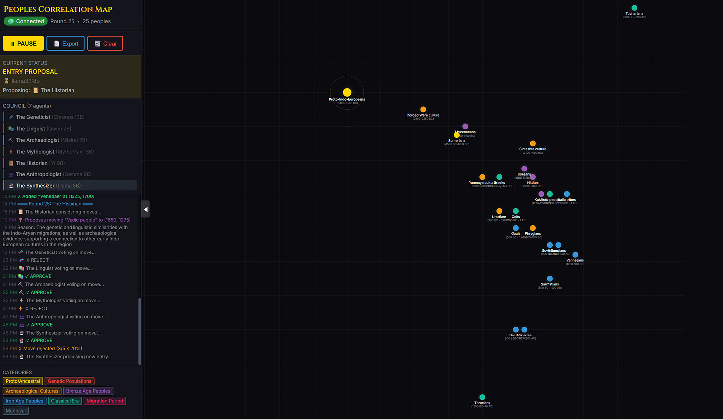 As a powerful complement to this master library, I then created another utility to scan the entire web for academic articles - to first gather all of those published in the past decade or two, but its now oriented to run in real-time every few days - to gather up every latest piece written on genetics, archaeology, linguistics, and anything at all with any relevance to piecing together the history of peoples and cultures and migrations. I’m up to several thousand articles thus far, and it’s been interesting to force one LLM to use these articles to defend and buttress or fortify a historical argument being made, and cause another LLM to use them to try to attack and criticize each argument being made. The combination of the massive context of tens of thousands of historical books in addition to all publicly available academic articles on related topics is uniquely potent.